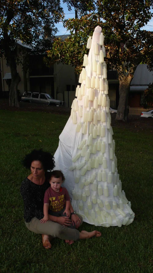 Engaging performance artist Victoria Hunt ( with child) depicted in traditional and shrouded stances, the notion of permanence is imbued within the discarded waste that is the plastic bottle.